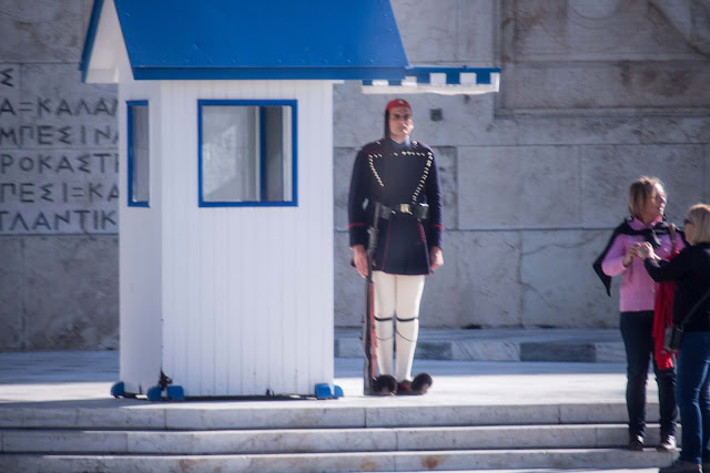 In my opinion, it may have been the inspiration for the Monty Python "Minister of Silly Walks" bit (no disrespect, it's just kinda funny to see). Goofy shoes or not, these guys are hand picked (you have to be at least 6' 2" to qualify) and tough as nails. In 1941 the Nazi's demanded the Greek flag be hauled down and replaced with the swastika at the Parthenon. The guard complied, but refused to hand over the Greek flag to the German officer. Instead, he wrapped himself in it and jumped off Acropolis to his death. In 2001 some moron threw a Molotov cocktail at the guard shack (made of wood). Even though the structure was fully engulfed in flames, the Evzone on duty refused to move until ordered to do so by an officer. He emerged with a scorched and smoking uniform and still stood at attention until relieved.